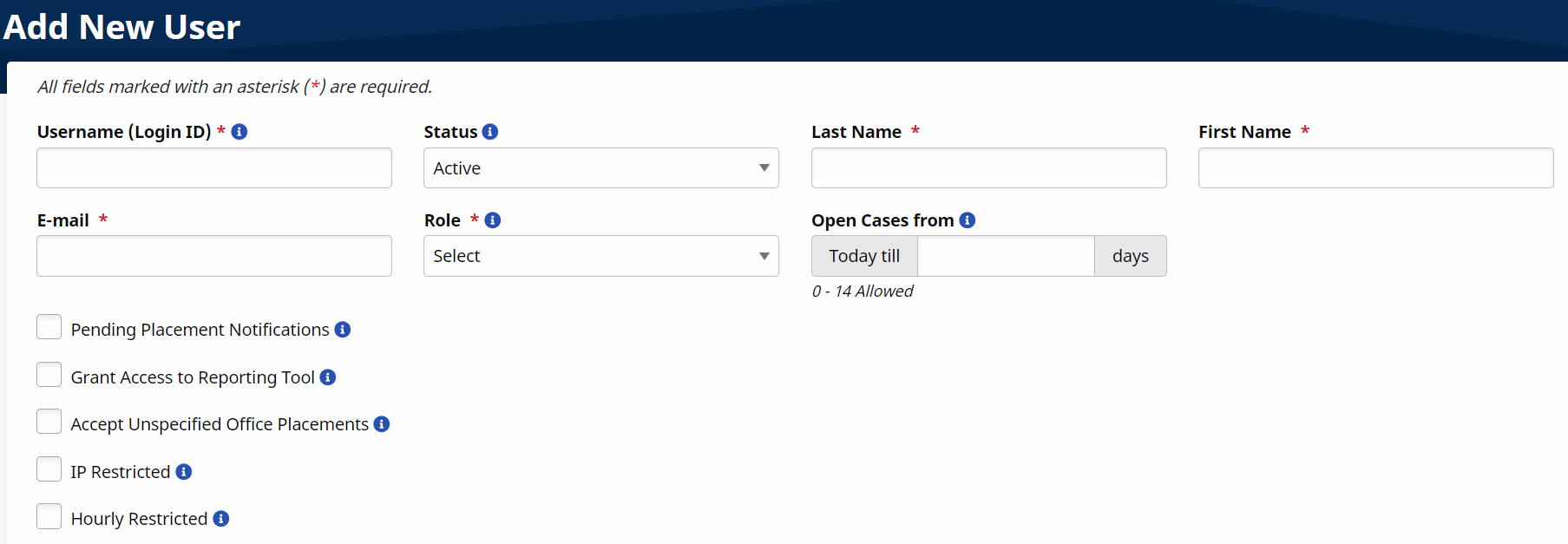 The Add New User page opens. Complete the required fields indicated by red asterisks and described in the table.