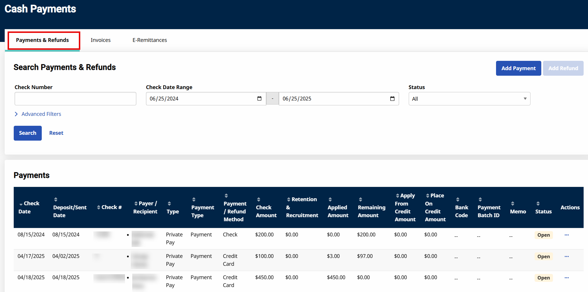 Go to the Payments and Refunds tab under Billing > Cash Payment and search for the check numbers that have been uploaded through the SFTP. Once located, review the check date, deposit date, check number, check amount, and the posted payments.