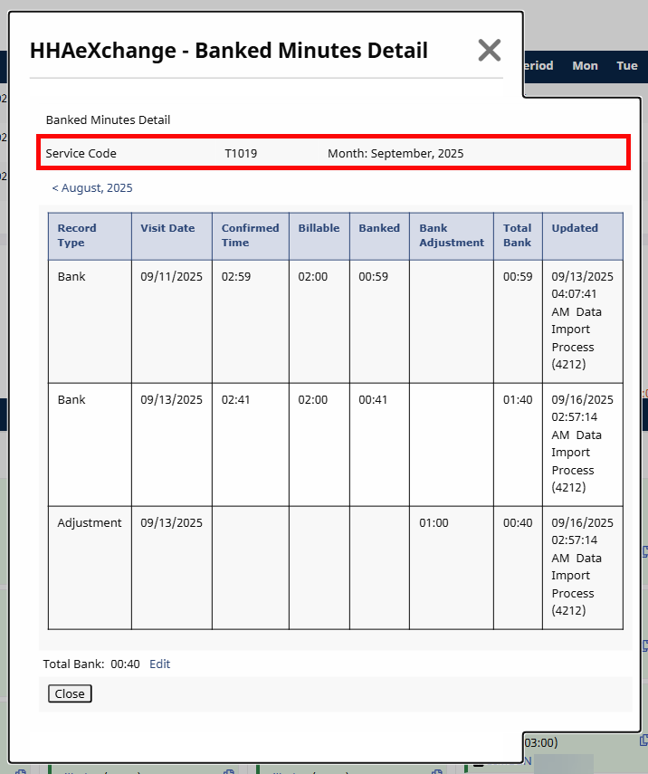 For example, the 9/1 visit is scheduled with T1019 as the Service Code. After the Banked Minutes calculation is applied, 10 minutes are manually adjusted leaving the bank with 1 hour for Service Code T1019.