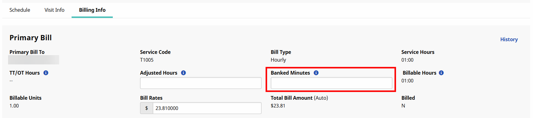 The banked period is applied to its own Banked Hours field for each visit. If selected, the Service/Billable Hours for each visit includes Banked Hours. Totals are added to Billed Hours on the Authorization section; otherwise, only visit service hours are indicated. |