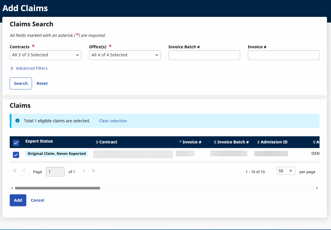 On the Add Claims page, select the batch(es) to submit and then click the Add button.