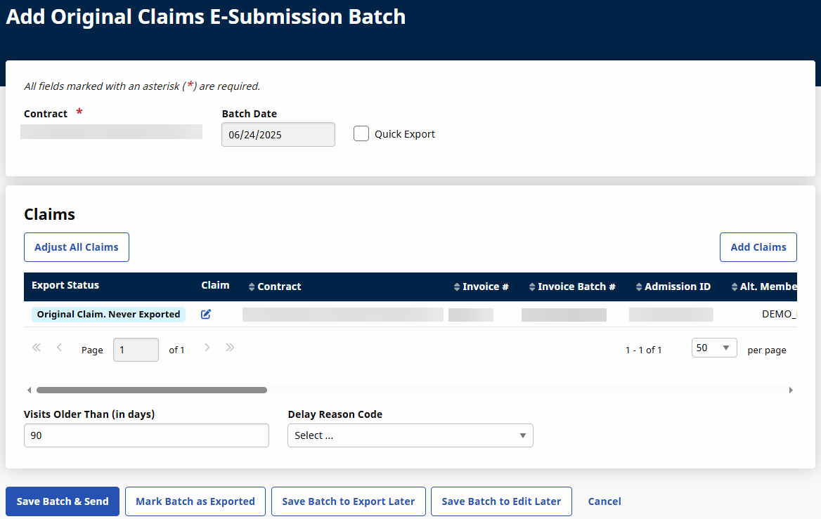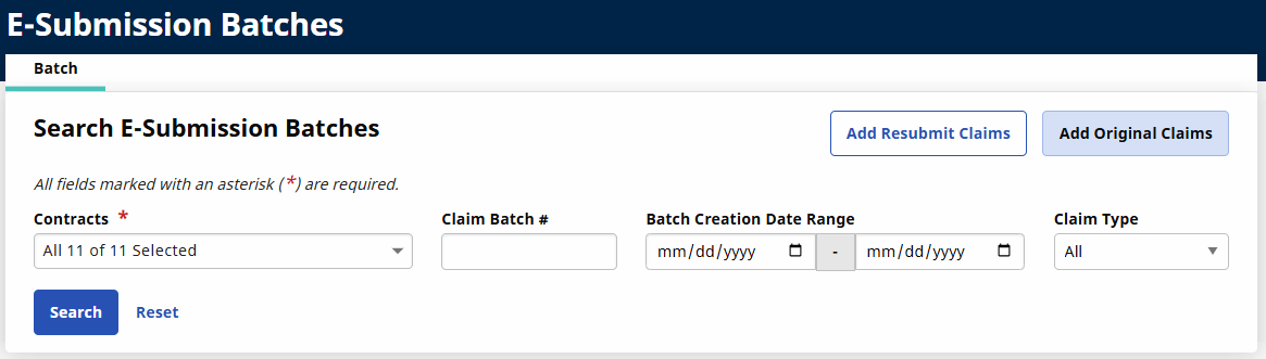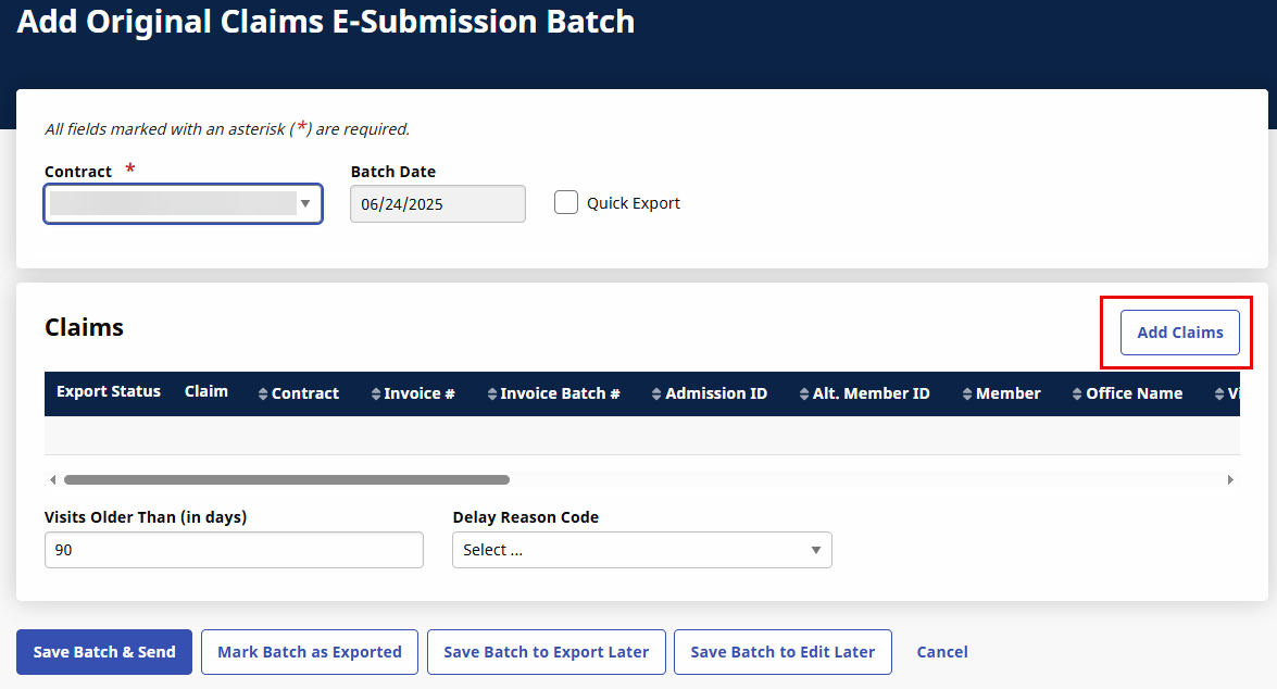 On the Add Original Claims E-Submission Batch page, select the Contract from the Contract field and then select the Add Claims button.