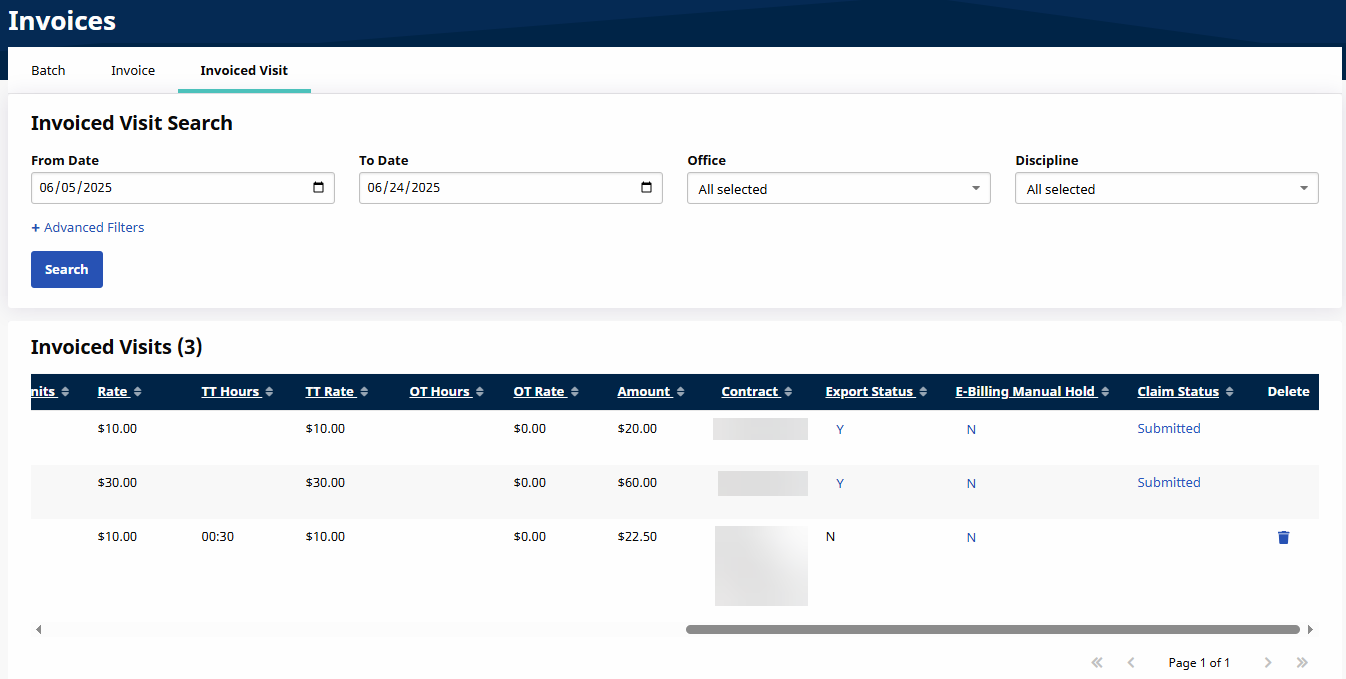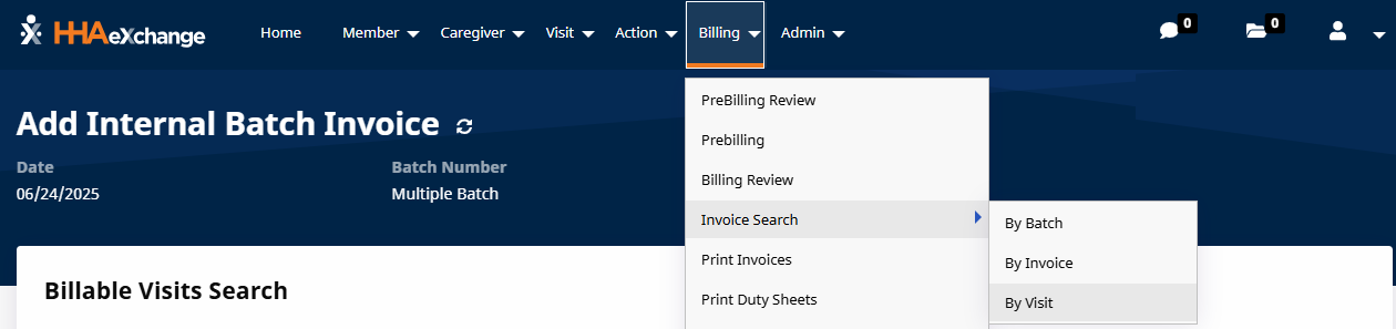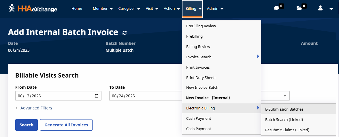 Go to Billing > New Invoice - (Internal) to generate a New Invoice Batch. Use the filters to search for specific visits or click Search to generate all results.