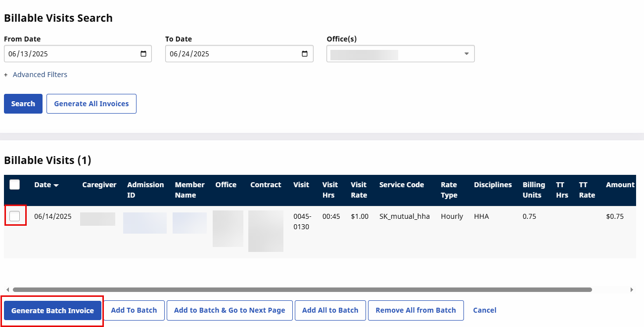 Select the visits to invoice and then click the Generate Batch Invoice button.
