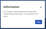 The system alerts that the export file is generating. Click Close to continue.