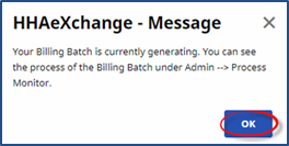 The system alerts the Billing Batch is generating. Click OK to continue.