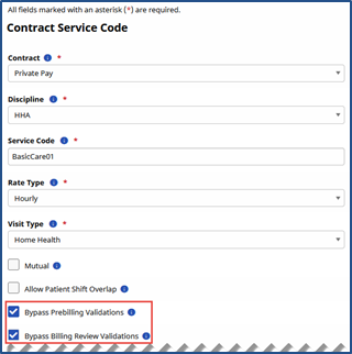 The below-listed Prebilling validations are exempt if Prebilling Bypass options are selected for Service Codes assigned to scheduled visits.