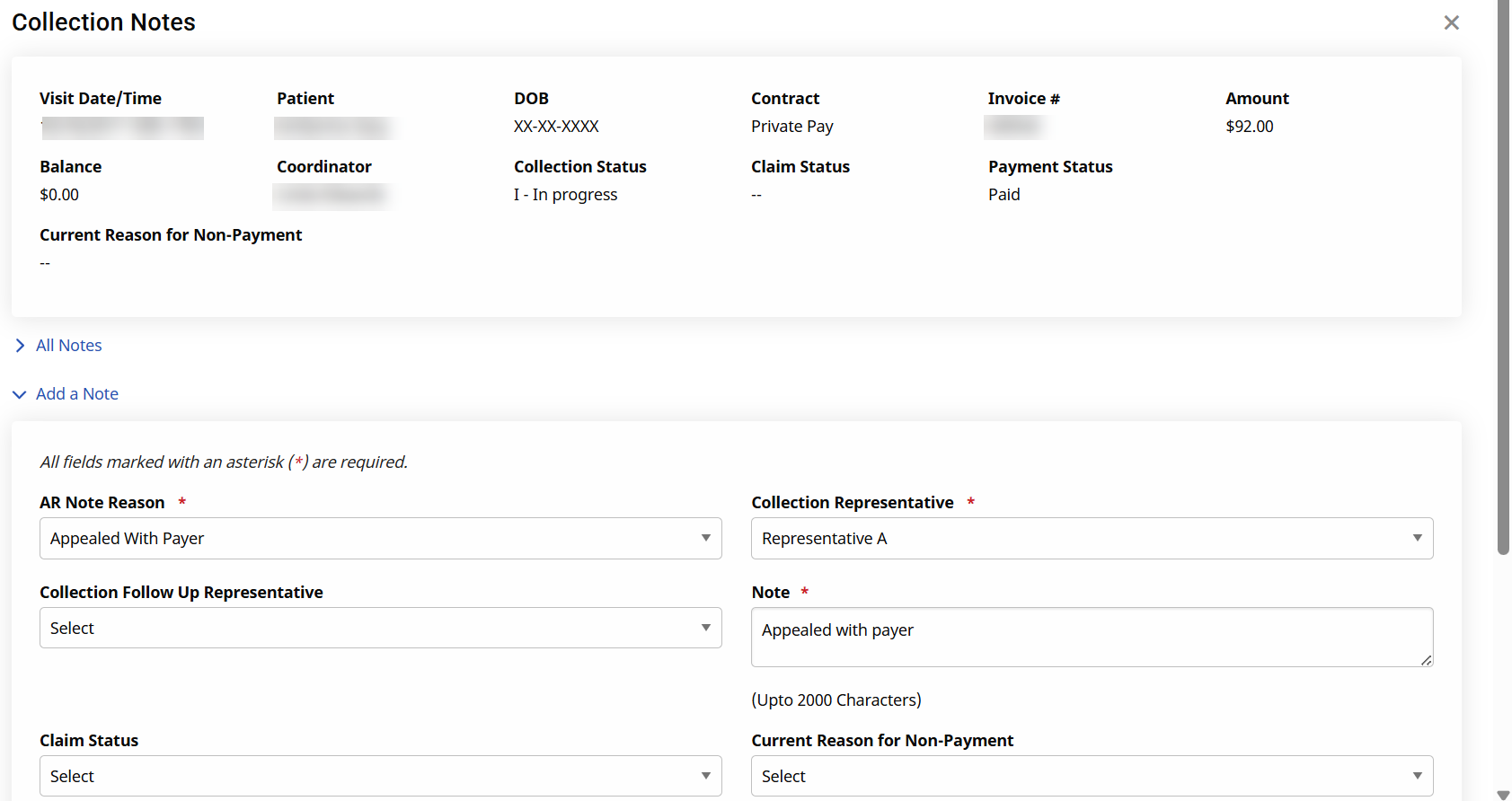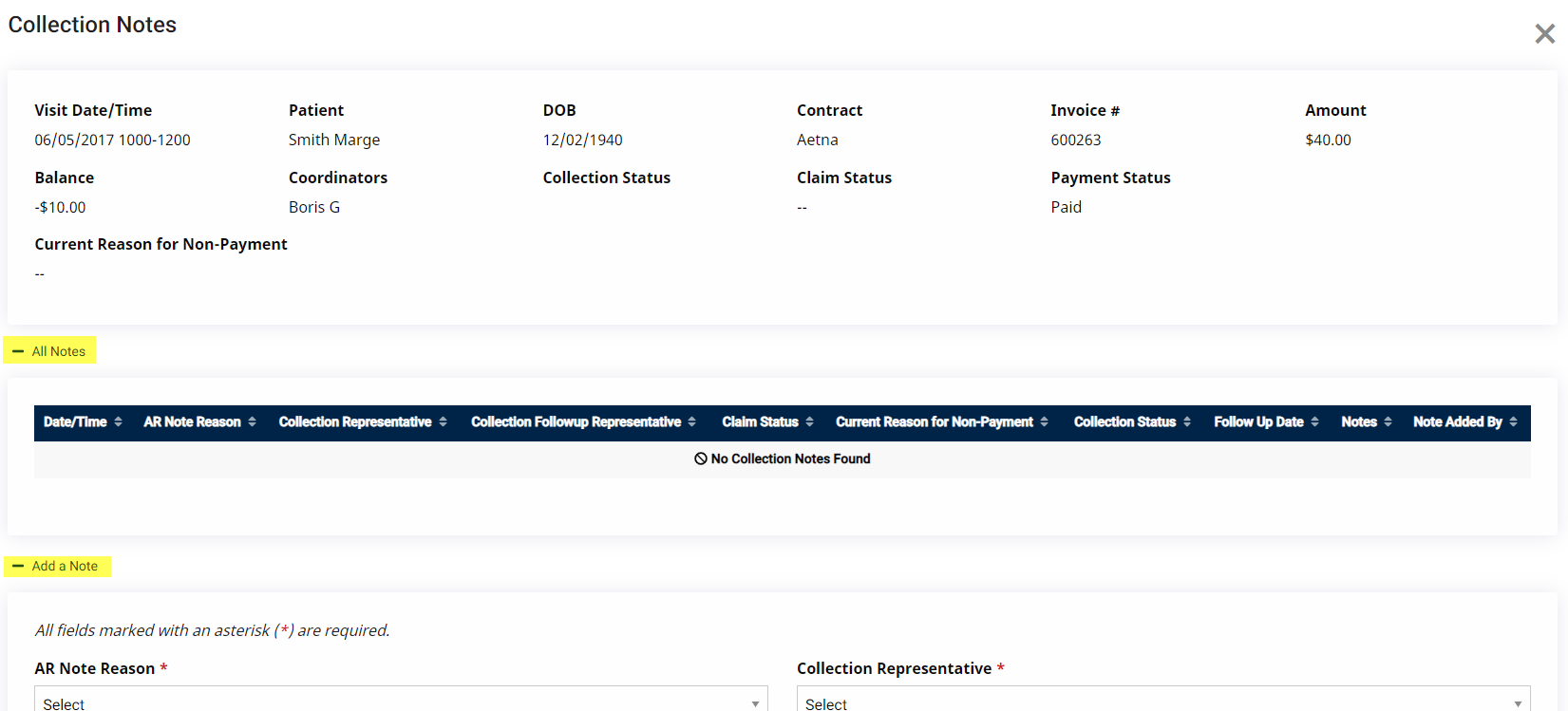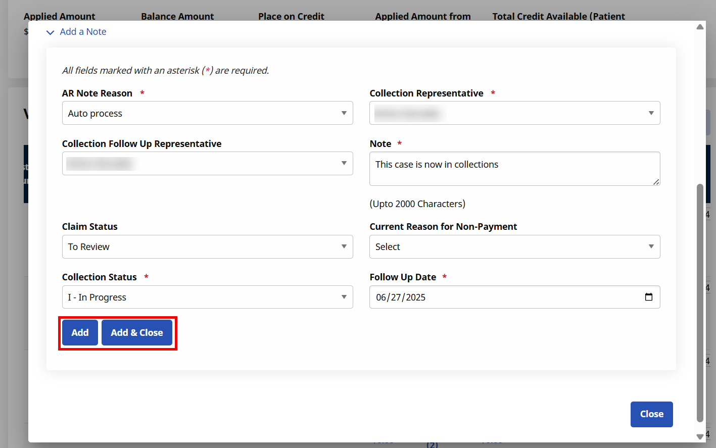 This feature relies on custom values setup by the Agency such as: AR Note Reason, Collection Representative, Collection Follow Up Representative, Claim Status, Current Reason for Non-Payment, and Collection Status (all Reference Table items).