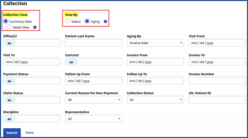 Go to Action > Collection and generate a search using the available filters to include the Collection View options (Summary or Detail View) as well as View By options (Status or Aging).