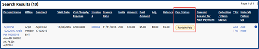 The following image illustrates when Detail View is selected from the View By field. From the search results, review any pertinent payment information associated with a visit. The Patient’s profile may be accessed corresponding to the applicable invoice for the visit as well as any notes associated with the issue.