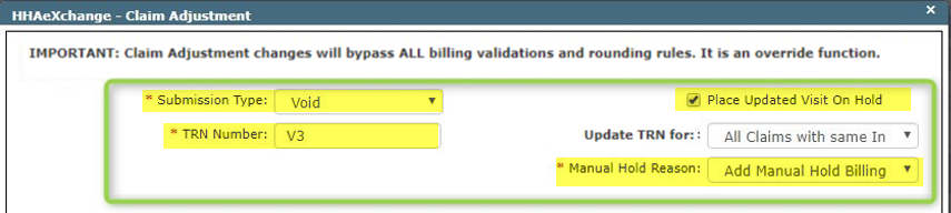 In addition to the TRN Number and Update TRN for fields, the Place Updated Visit on Hold checkbox also becomes available. If selected, the required Manual Hold Reason field populates when selecting Void. Selecting Void hides other adjustment information fields on the window. |