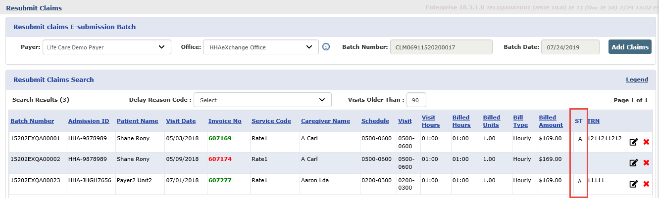 When this feature is enabled, the Submission Type (ST) column in the Resubmit Claims page displays A for those claims that have been resubmitted as an Adjustment and have a TRN Number. Records without a TRN Number display blank.