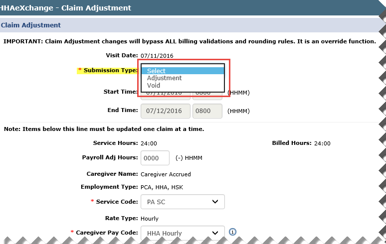 On the Claim Adjustment screen, the Submission Type field is required. There are three Submission Types: Original, Adjustment, and Void.