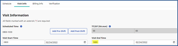 To correct both validation issues, click the Edit icon to open the visit details. On the Visit Info tab, manually adjust the Confirmed Times and save to eliminate the overlap.