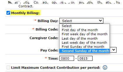 On the Additional Bill Info window, scroll to the Monthly Billing section. Select the Monthly Billing checkbox to enable the options. Complete the required fields (denoted with red asterisk), to include the Billing Day.