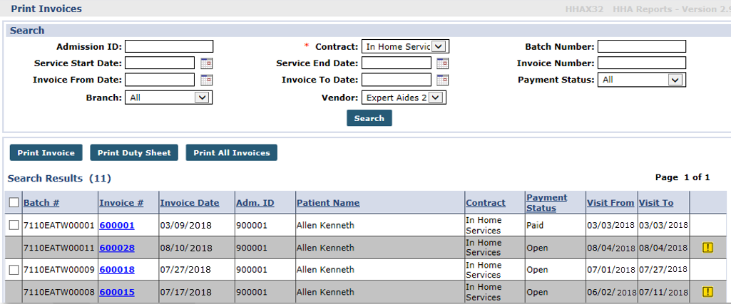 Click Print All Invoices to generate a PDF version of all invoice information returned OR select the checkboxes (to the left of each record) for the desired invoices and click the Print Invoice button. Invoices print in the selected format set on the Admin > Contract Setup page.