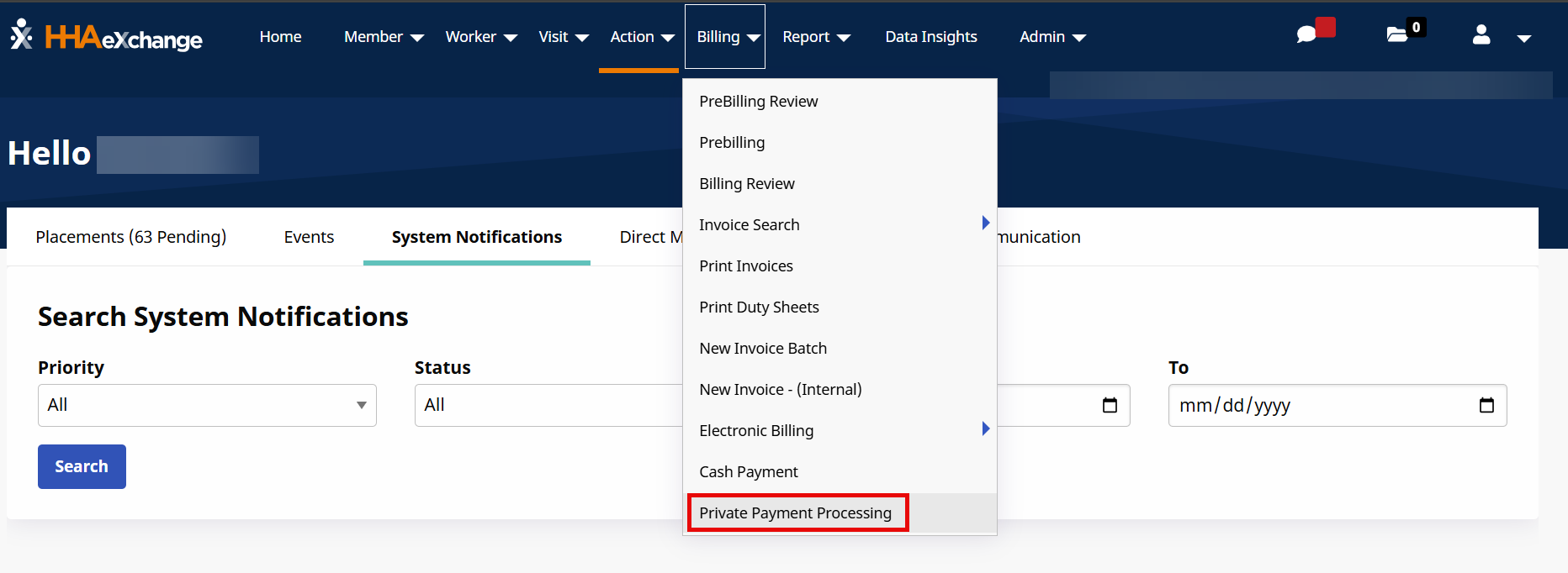 The Private Payment Processing feature under Billing > Private Payment Processing allows agencies to send and receive digital payments from patients or designated payers and manage all private payment activity in one place. This feature streamlines payment management with tools for invoicing, refunds, payment tracking, and account settings.