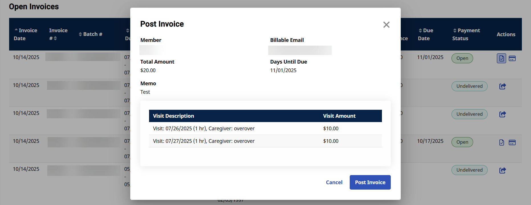 The Invoices tab allows you to review open invoices, paid invoices, and manage refunds.