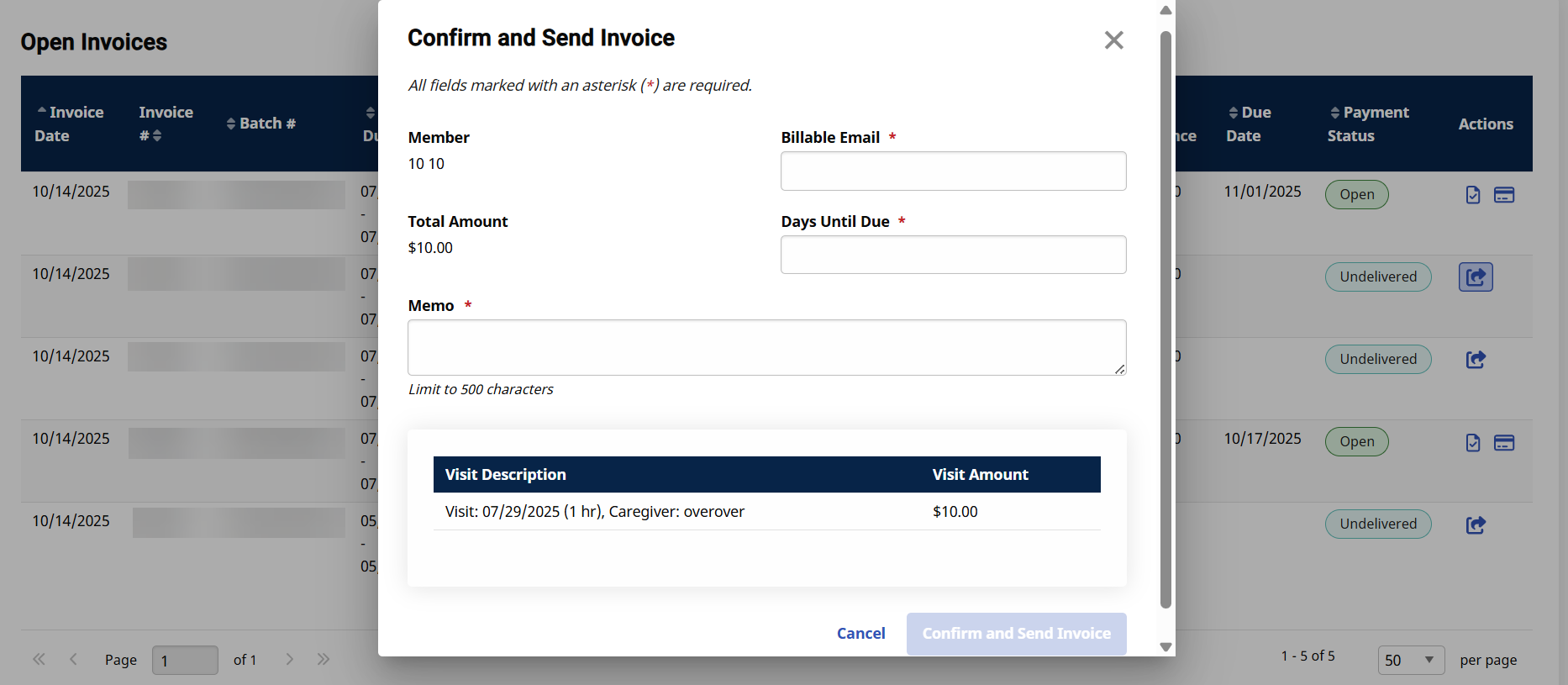 Search for open invoices on the Open Invoices tab. Enter search parameters and then select Search. Your open invoices display.