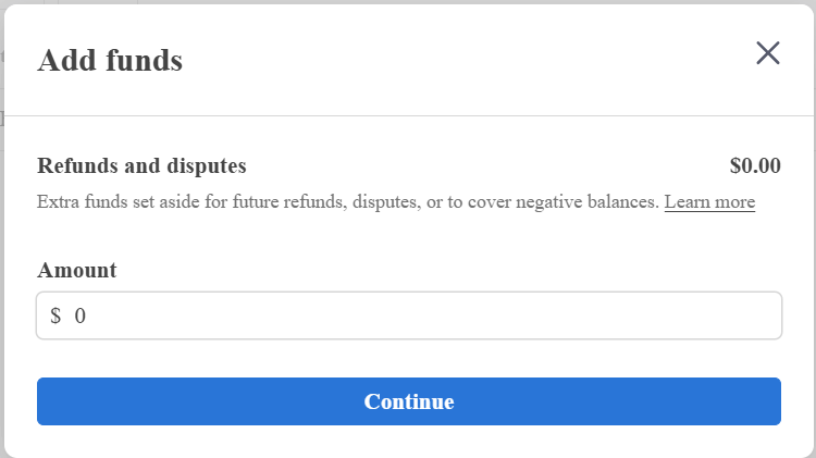 Select Add to Balance to cover negative balances. Enter the amount on the Add Funds window and then select Continue.