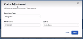 The Claim Adjustment window opens. On the Submission Type field, select Original, Adjustment, or Void. Make any other necessary edits to the claim and click Save to finalize. Repeat this step for all applicable adjustments.