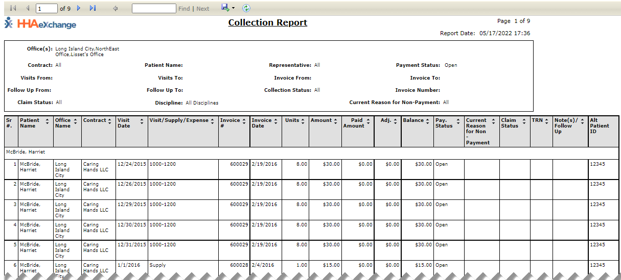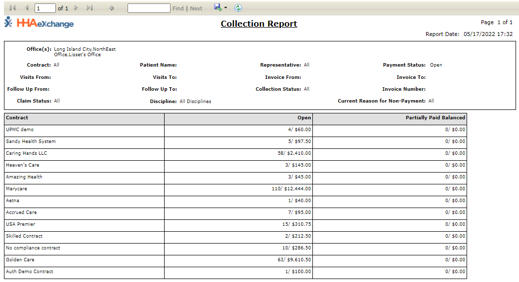 The Collection Report, Summary View under Action > Collection displays information from the Collection Dashboard in the Summary View. This report displays information based on the search parameters set on the Collection page. To run this report:
