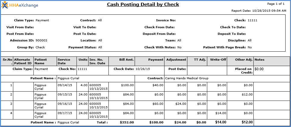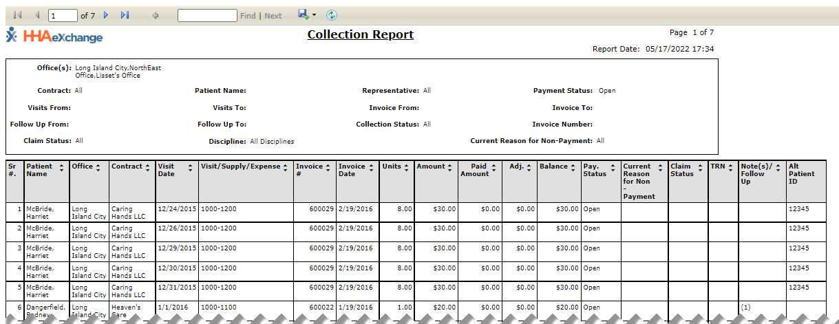 The Collection Report, Detail View under Action > Collection displays information from the Collection Dashboard in the Detail View. This report breaks down the information by Patient according to the search parameters set on the Collection page. To run this report: