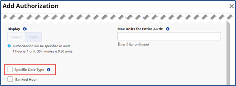 In the Patient Authorization window, the Specific Date Type checkbox (below the Max Unit for Entire Auth field) allows one to create Weekend, Weekday, and Holiday Authorization limits. This checkbox is only visible if the Period type selected is Daily or Weekly. The option hides if any other Period type is selected (such as Monthly or Entire Period).