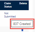 Hovering over the Claim Status link provides a tool tip for the status. In this example, the 837 file has been Created, but not yet Submitted.