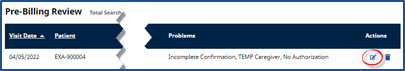 The visit is sent to Prebilling. Click the Edit icon to open the visit.