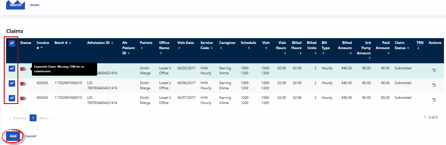 On the E-Submissions Batches page, select applicable Contracts and then select the Add Resubmit Claims button.