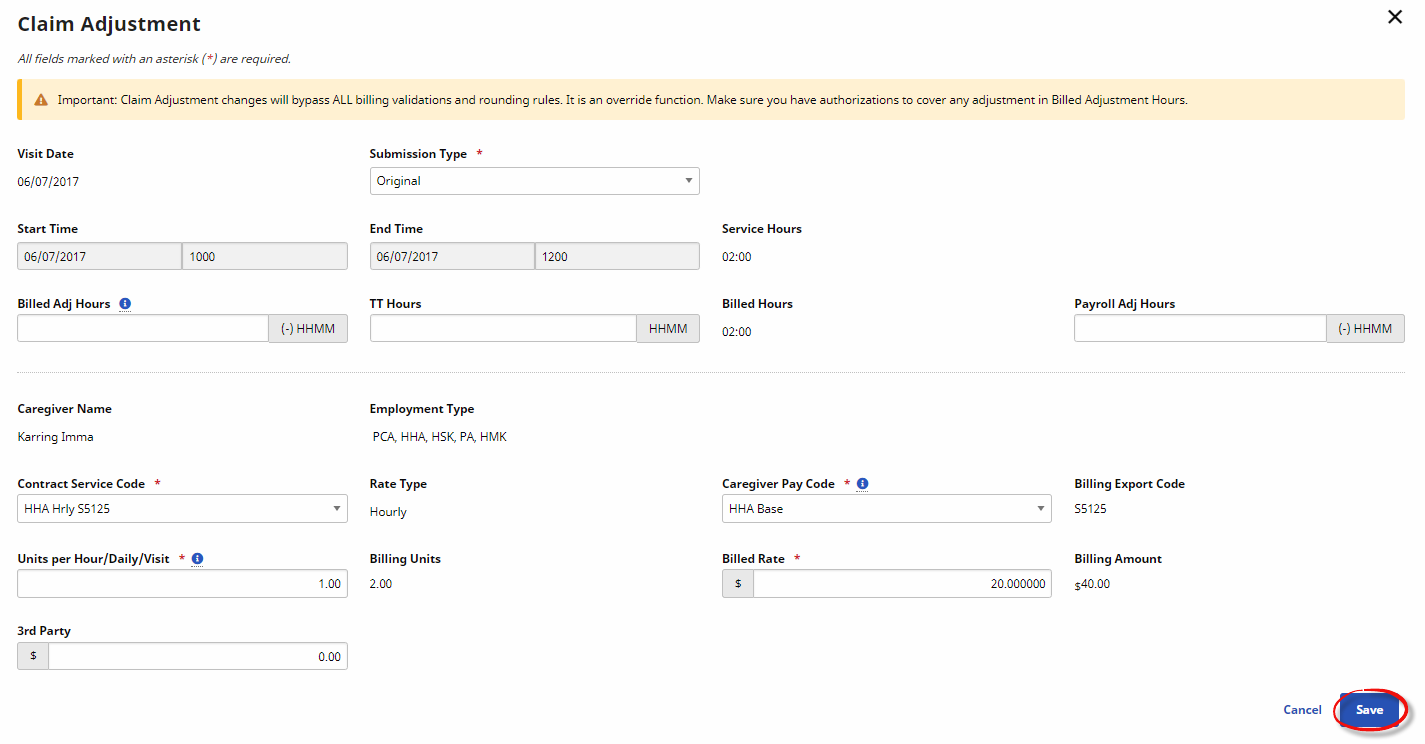 Click the edit icon Edit icon to open the Claim Adjustment window, enter the correct information and then select Save. Repeat for all claims.