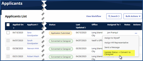 Select the Update Status option from the Actions column to update the Applicant’s status to the next anticipated status in line based on the workflow configuration.