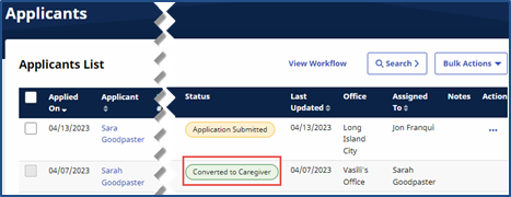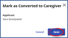 In the Mark as Converted to Caregiver window, click Save to save the newly updated status such as Application in Progress.