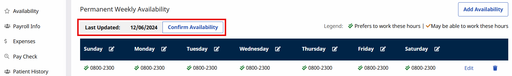 A Confirm Availability button is also available in the Permanent Week Availability section to allow Providers to update the Last Updated date without editing the Caregiver’s availability. Once clicked, the Last Updated field is updated to reflect the date when changes were made.