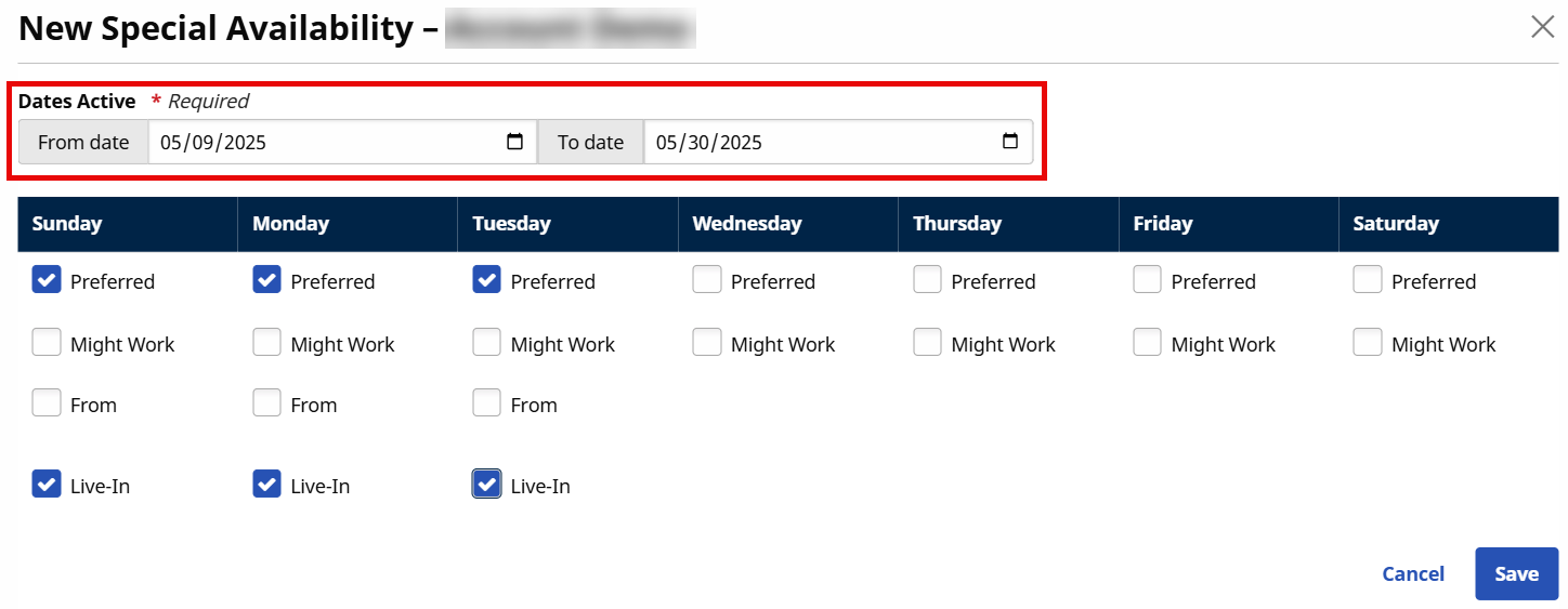 The New Special Availability screen appears providing various fields as shown. Select the date range, Date From/To (required, as denoted by the red asterisks). Select the Preferred and Might Work checkboxes per day to indicate the Caregiver availability for the selected period.