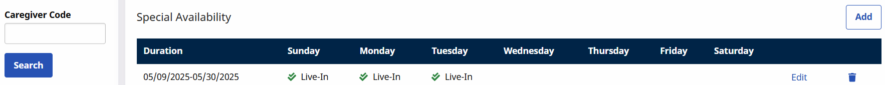 Special Availability under Caregiver > Search Caregiver > Availability works the same as Permanent Week Availability. A Special Availability schedule is created when the Caregiver’s schedule varies for a certain amount of time (such as holiday seasons). Follow the steps below to add a Special Availability schedule.