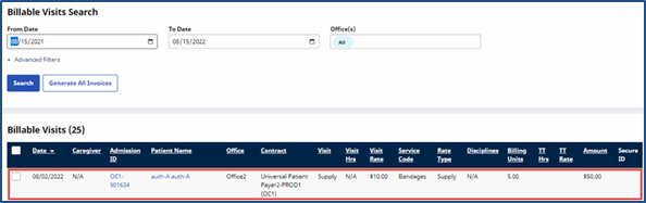 Supplies are billed identically to visits. From the Billing > New Invoice (Internal) page, select the Supply line item and apply it to an invoice.