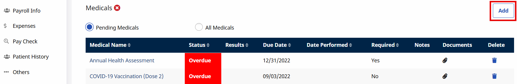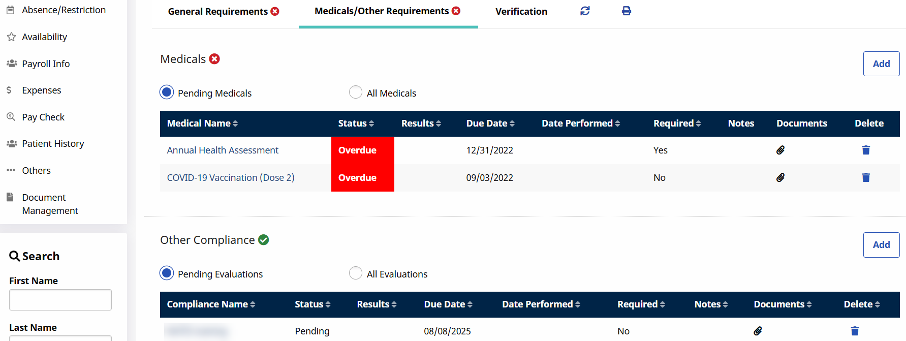 To manually apply a new Medical requirement, click the Add button in the Medicals section of the Medicals/Other Requirements tab under Caregiver > Search Caregiver > Compliance.