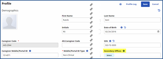 On an existing Caregiver’s Profile under Caregiver > Profile page, a Secondary Offices field is made available once the Caregiver’s record has been saved.
