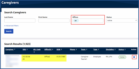 When performing a Caregiver Search, the Office field is preselected to All to include all Offices (Primary and Secondary) assigned to the Caregiver. Users with permissions to the Caregiver’s Primary Office can view Caregivers’ SSN and DOB information for all associated offices. Permissions at the Primary Office level also allow a user to delete a Caregiver.