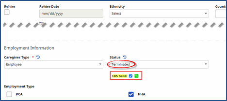 When a Caregiver Status is changed to Terminated in the Caregiver Profile page, a 105 Sent checkbox becomes available. To the right of the 105 Sent checkbox, a green Paperclip icon (attachment) is used to upload any supporting documentation.