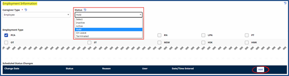 The Caregiver Status function allows Agencies to track employment status in the system to ensure that only authorized, available Caregivers may be scheduled. The Caregiver Status is the determining factor when scheduling a Caregiver to provide service.