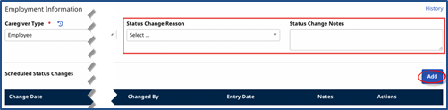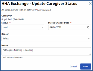 (Optional) Enter a Reason (setup using the Caregiver Status Reason Reference Table) and Note when changing a Caregiver’s Status, providing a more complete record for the employment status change.