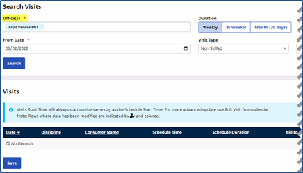 On the Caregiver > Visits page, the Office(s) field is required when searching for visit information. The Caregiver’s Primary Office is auto-selected, provided that the user has access. If the user does not have access to the Primary Office, then the Office must be manually selected from the dropdown menu (list of a Caregiver’s associated offices). Refer to the Secondary Office Patient Search for further information.
