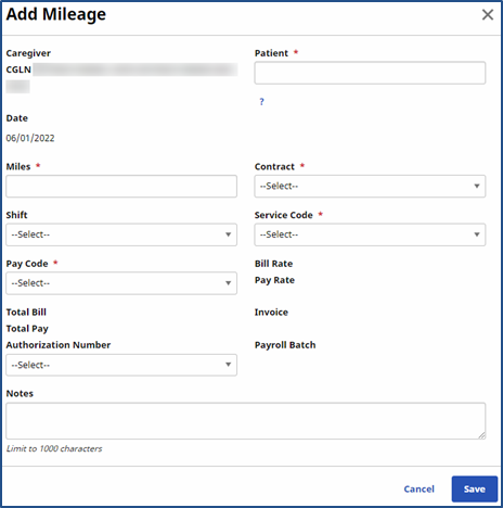 The Mileage window opens displaying the same fields. In this case, however, the Patient field is pre-populated. Select/Search for the applicable Caregiver OR select the Shift from dropdown field for the respective Caregiver to auto-populate.