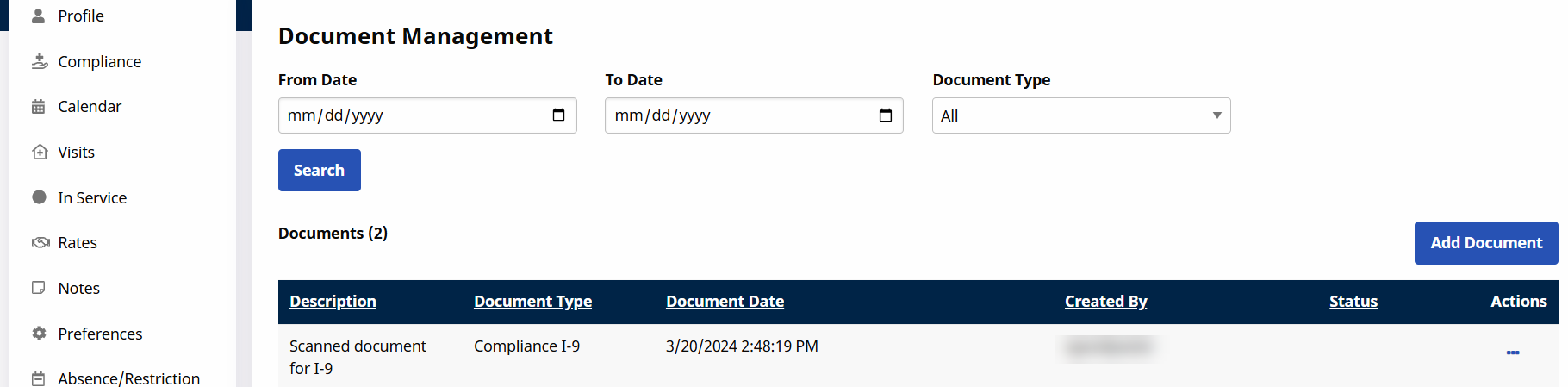 Document Management under Caregiver > Search Caregiver > Document Management is used to search for uploaded documentation on the Caregiver Profile. To perform a search, enter the From/To Dates fields and/or select the Document Type from the options.