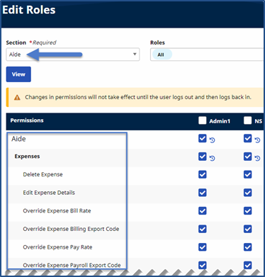 To activate these permissions, go to Admin > User Management > Edit Roles and select the Aide from the Section field.