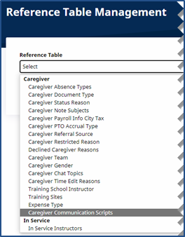 Message scripts are created and managed via the Reference Table Management functionality. To access, go to Admin > Reference Table Management. From the Reference Table field, select Caregiver Communication Scripts from the Caregiver category.
