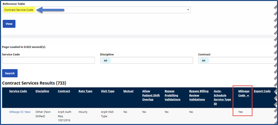 The Mileage Service Codes are created and managed via the Reference Table Management function under Admin > Reference Table Management. To access, select Contract Service Code from the Reference Table field and click Search. A Mileage Code column indicates if a Service Code/Contract is associated to Mileage.